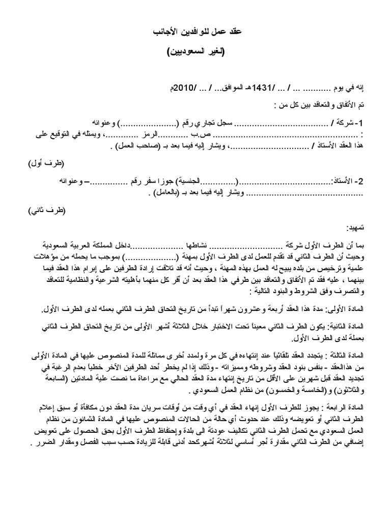 نموذج عقد عمل للوافدين الأجانب لغير السعوديين