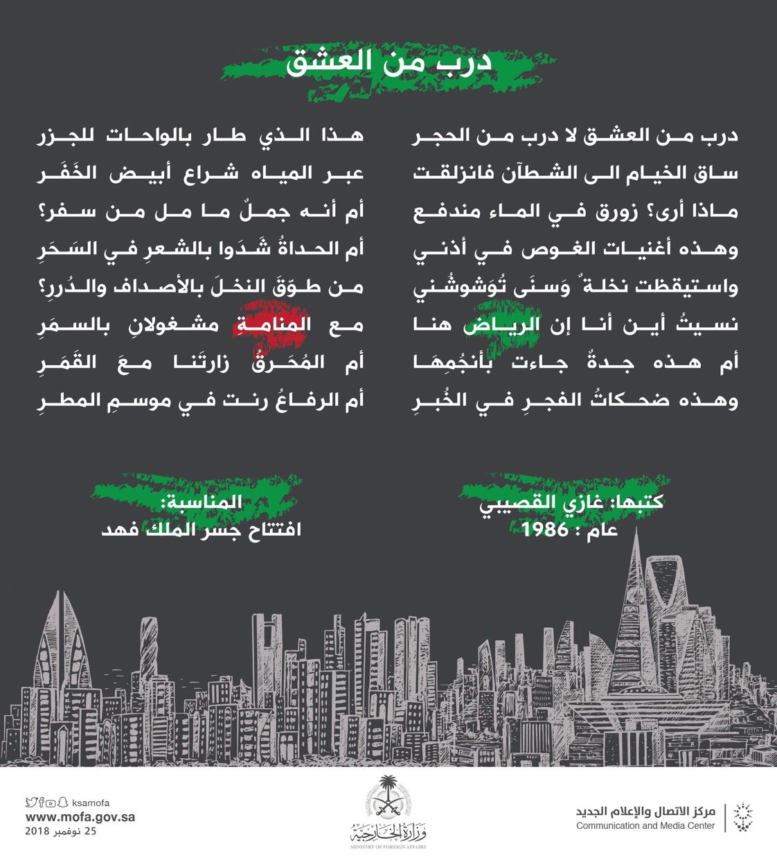 بوابة البحرين On Twitter درب من العشق لا درب من الحجر هـذا الـذي طـار بالـواحـات للـجـزر من قصيدة الراحل غازي القصيبي بمناسبة افتتاح جسر الملك فهد بين المملكة والبحرين انورت البحرين بمحمد بن سلمان Https T Co Nsqmpny7bj
