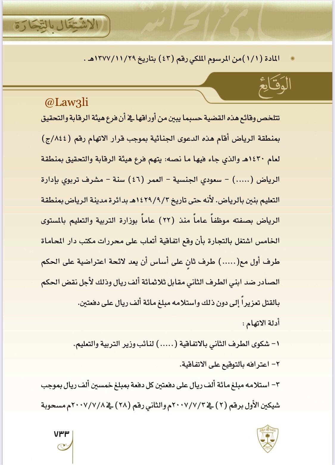 مختارات عدلية On Twitter حكم قضائي بعدم الإدانة في قضية إشتغال بالتجارة التهمة اشتغال موظف حكومي بالتجارة الوقائع قام هذا الموظف بإعداد لائحة اعتراضية لنقض حكم بالقتل تعزيرا
